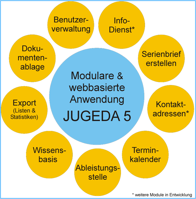 JUGEDA ist eine Fachanwendung mit browserbasierter Benutzeroberfläche zur Verwaltung aller relevanten Daten und Vorgänge der Jugendhilfe im Strafverfahren (JuHiS) bzw. der Jugendgerichtshilfe (JGH) und wird in enger Zusammenarbeit mit den JUGEDA-Kunden wie der JGH Dresden und JGH Leipzig stetig weiterentwickelt. Sie orientiert sich an den Arbeitsabläufen und Aufgaben der JuHiS bzw. der Jugendgerichtshilfe im kommunalen Umfeld.