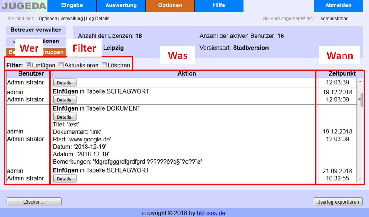 Das Modul JUGEDA-Userlog wurde entwickelt, um einerseits die Überprüfung von beabsichtigten oder unbeabsichtigten Nutzeraktionen und andererseits die generelle Nachvollziehbarkeit von Datenänderungen zu gewährleisten.