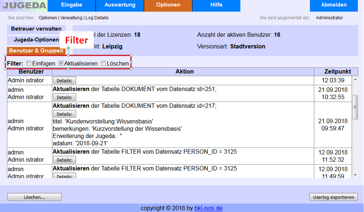 Im Userlog werden alle Aktionen innerhalb der JUGEDA verzeichnet, welche Änderungen in der Datenbank hervorrufen. Das bedeutet, dass jedes Erzeugen, Bearbeiten oder Löschen eines Datensatzes im Userlog erfasst wird.