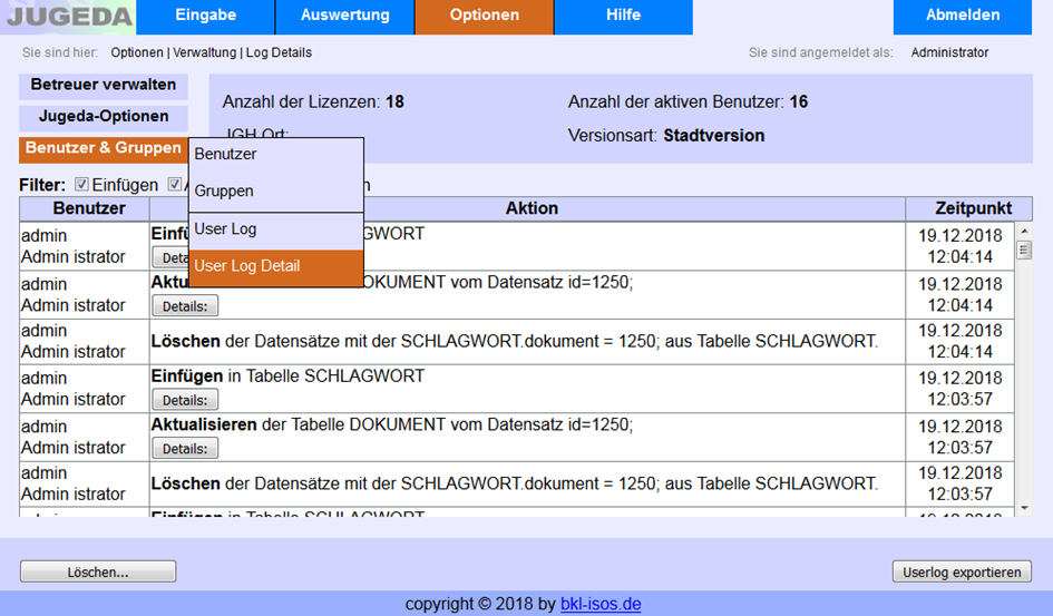 Das Userlog ist im Verwaltungsmenü zu finden. Ausschließlich Nutzer mit entsprechenden Rechten können dieses Modul einsehen, das Log exportieren oder die Userlogdaten löschen.